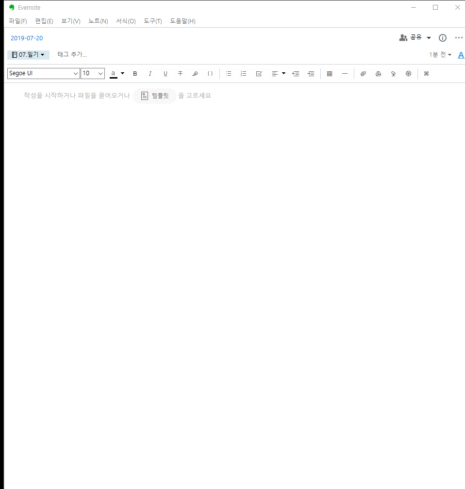 단축키 하나로 정상적으로 에버노트가 실행되고 일기에 새노트를 만든 후 제목에 날짜 까지 넣은 상태가 되었다.