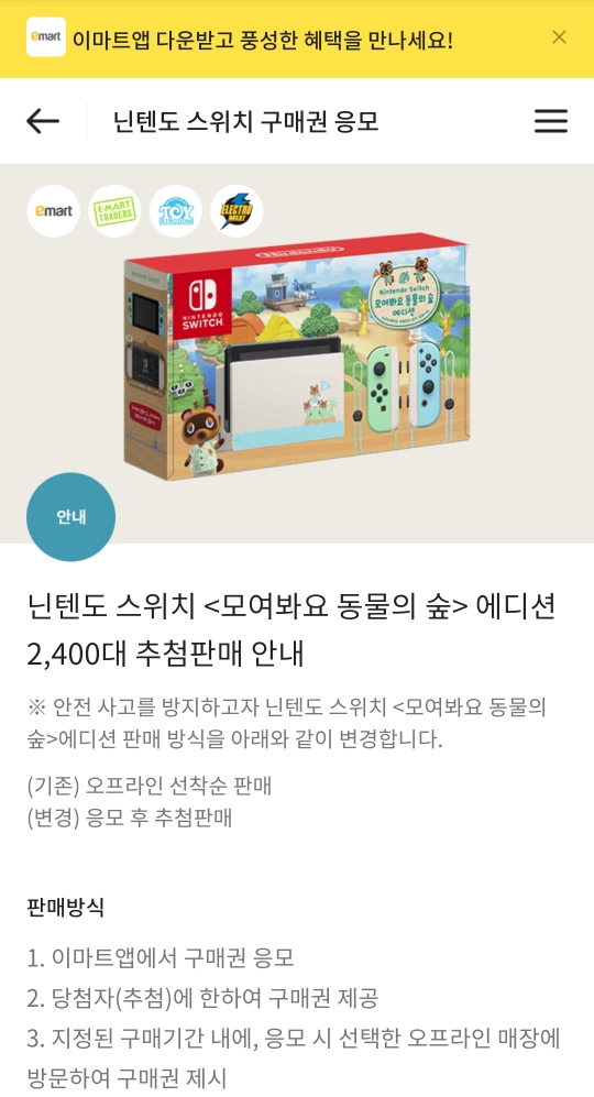 그러던 와중에 이마트에서 동물의숲 에디션 2400대에 대해서 구매할 수 있는 권리를 추첨하기로한 소식이 나왔습니다!!!