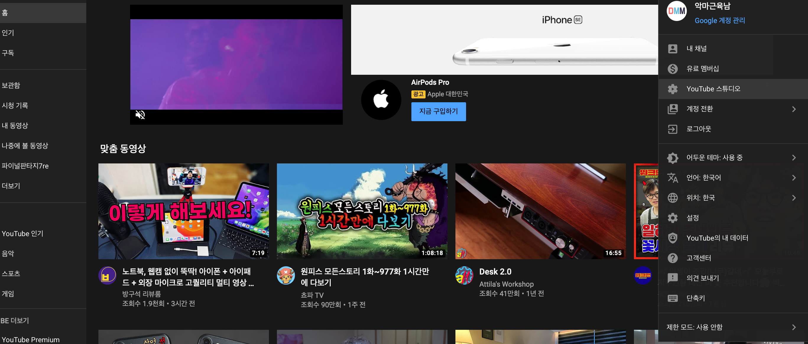 오른쪽 계정 밑에 보이는 YouTube 스튜디오에 들어가면