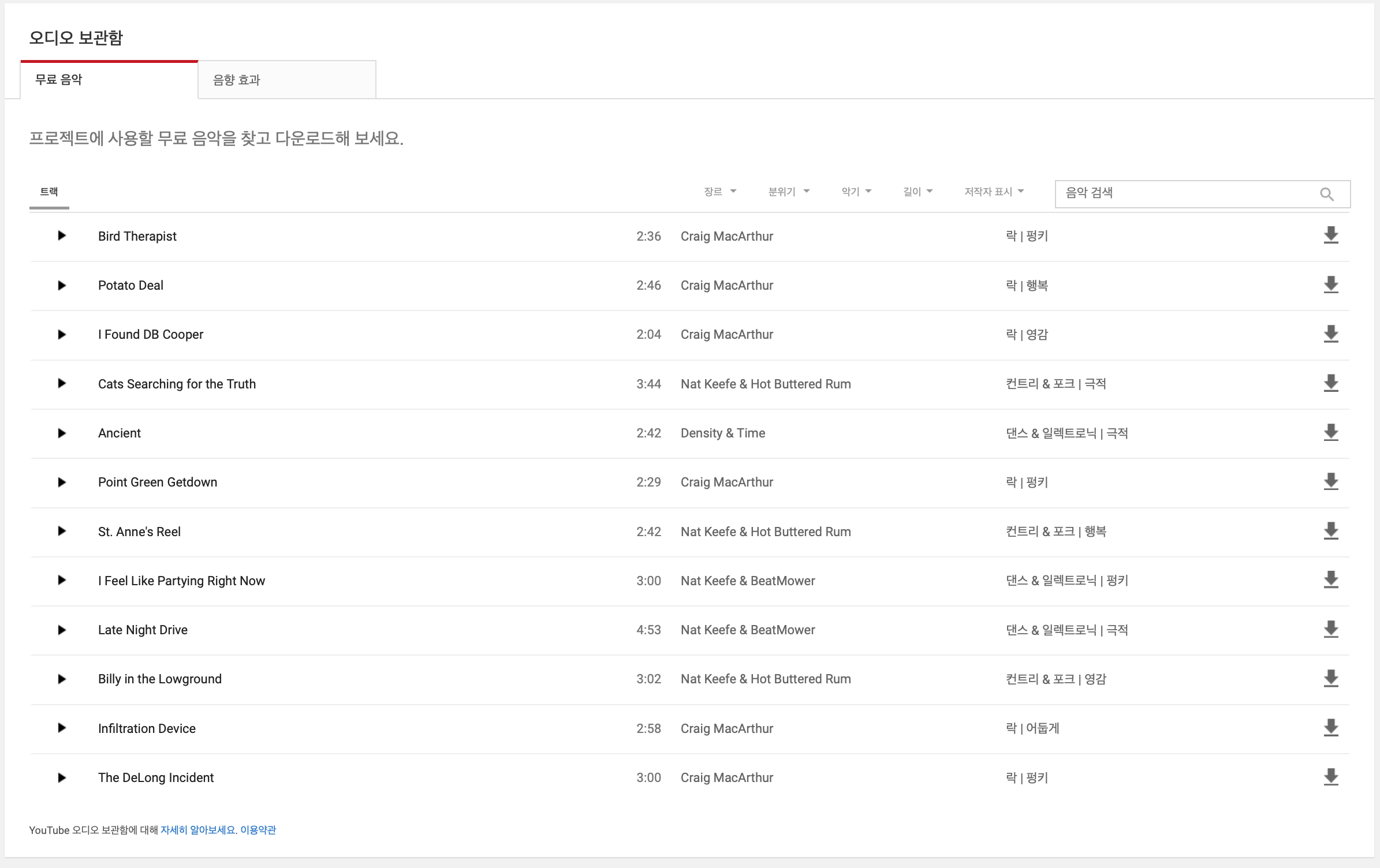 이렇게 다양한 노래와 음향효과들을 저작권 문제없이 다운받아서 사용할 수 있습니다.