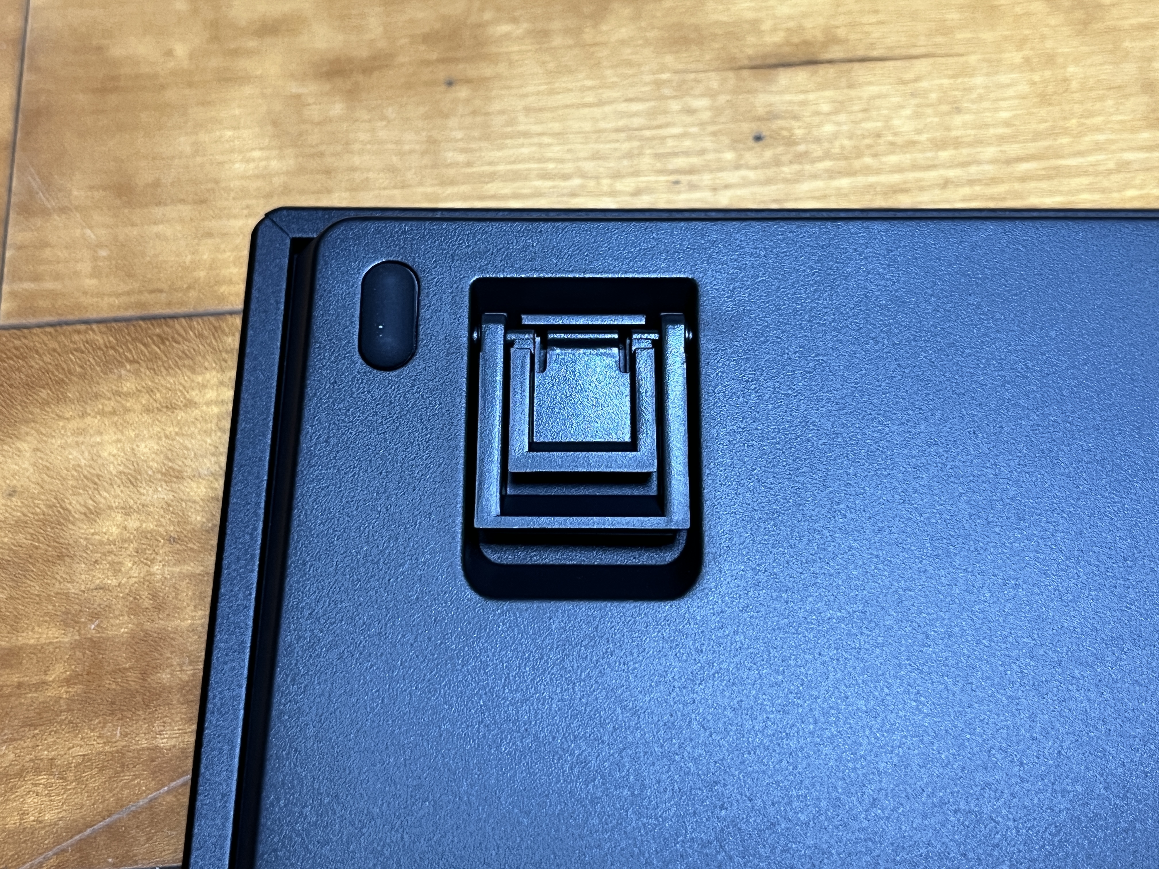 뒷판의 거치대로 키보드의 각도를 평평 ==> 1단계 ==> 2단계로 총 3단계로 조절 할 수 있습니다. 저는 기본적으로 각도가 있는게 타이핑하기 편해서 최대한으로 올리고 사용하고 있습니다.