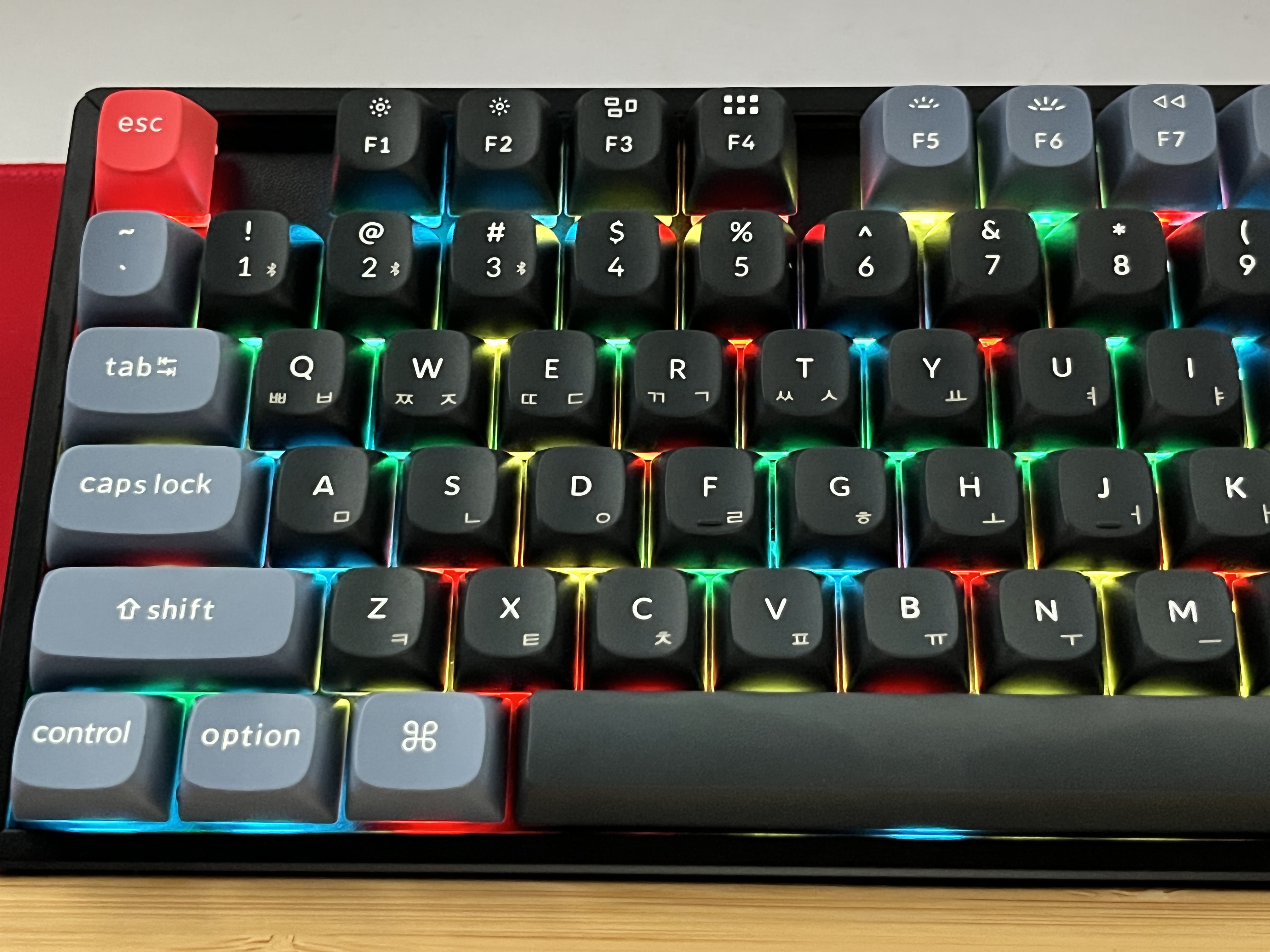 디자인입니다. 기능키와 특수키들은 푸른색, 아주 많이 쓰는 기는 붉은색 (ESC, Enter) 그외의 키들은 검정색 키캡으로 되어있습니다.