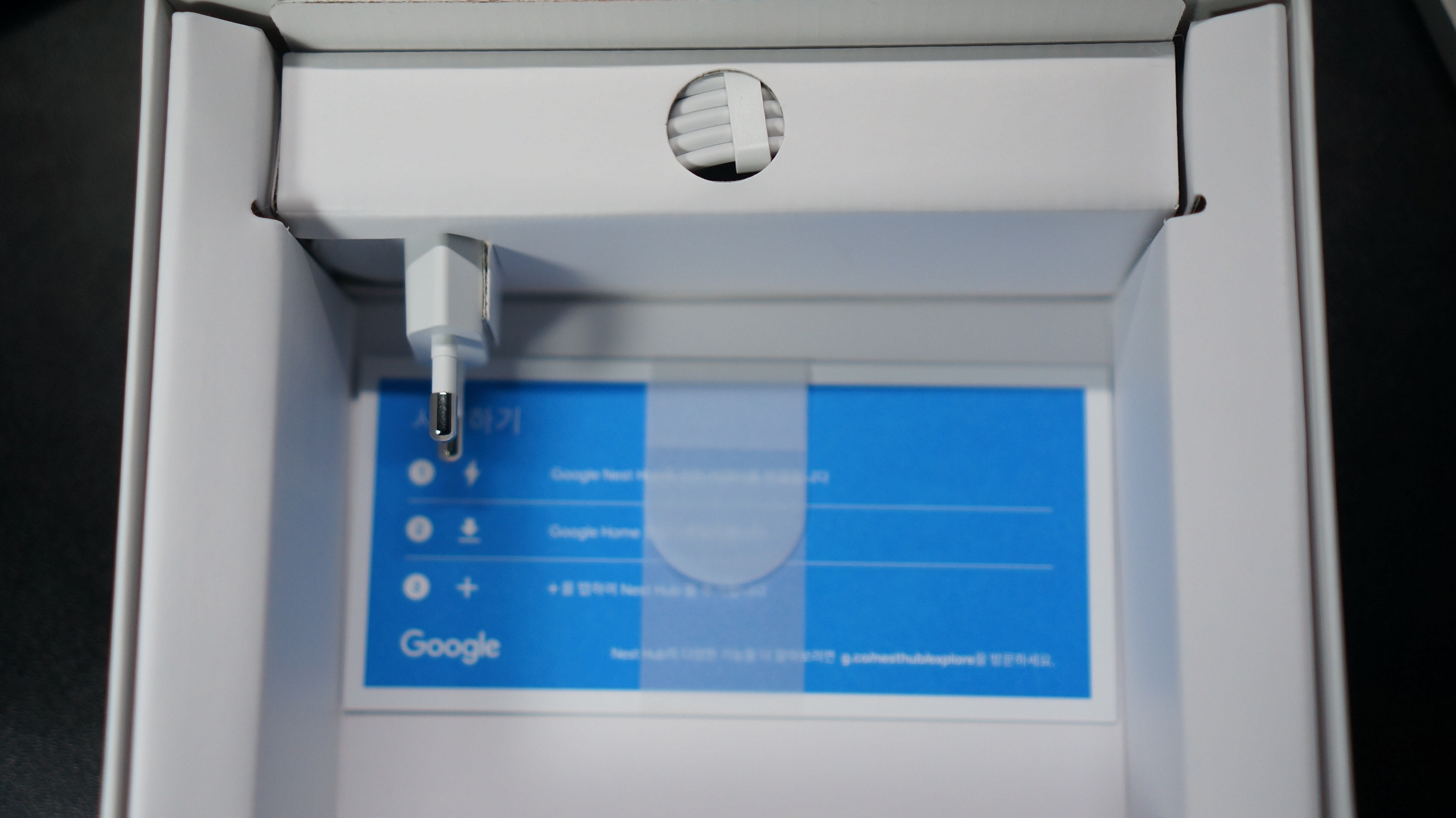 제품 빼면 전선이 있습니다. 구글 네스트 허브는 c 타입으로 전기를 공급하는게 아니라 하는게 아니라 전용 규격의 어댑터를 사용합니다.