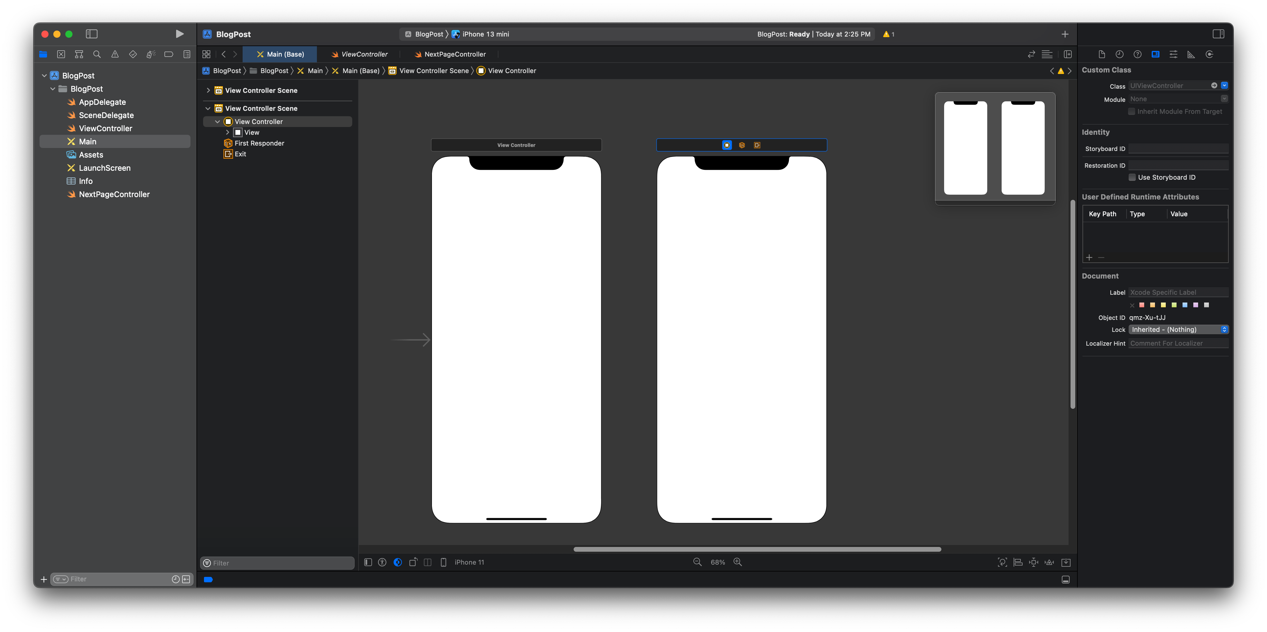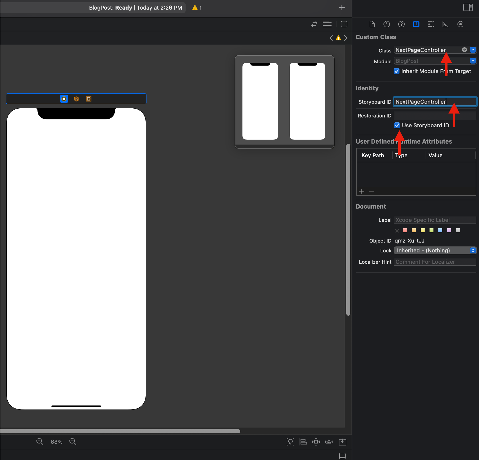 두 번째 페이지를 누르고 우측패널의 쇼인스펙터 창에서 클래스를 방금 만든 NextPageController 로 설정해 줍니다.