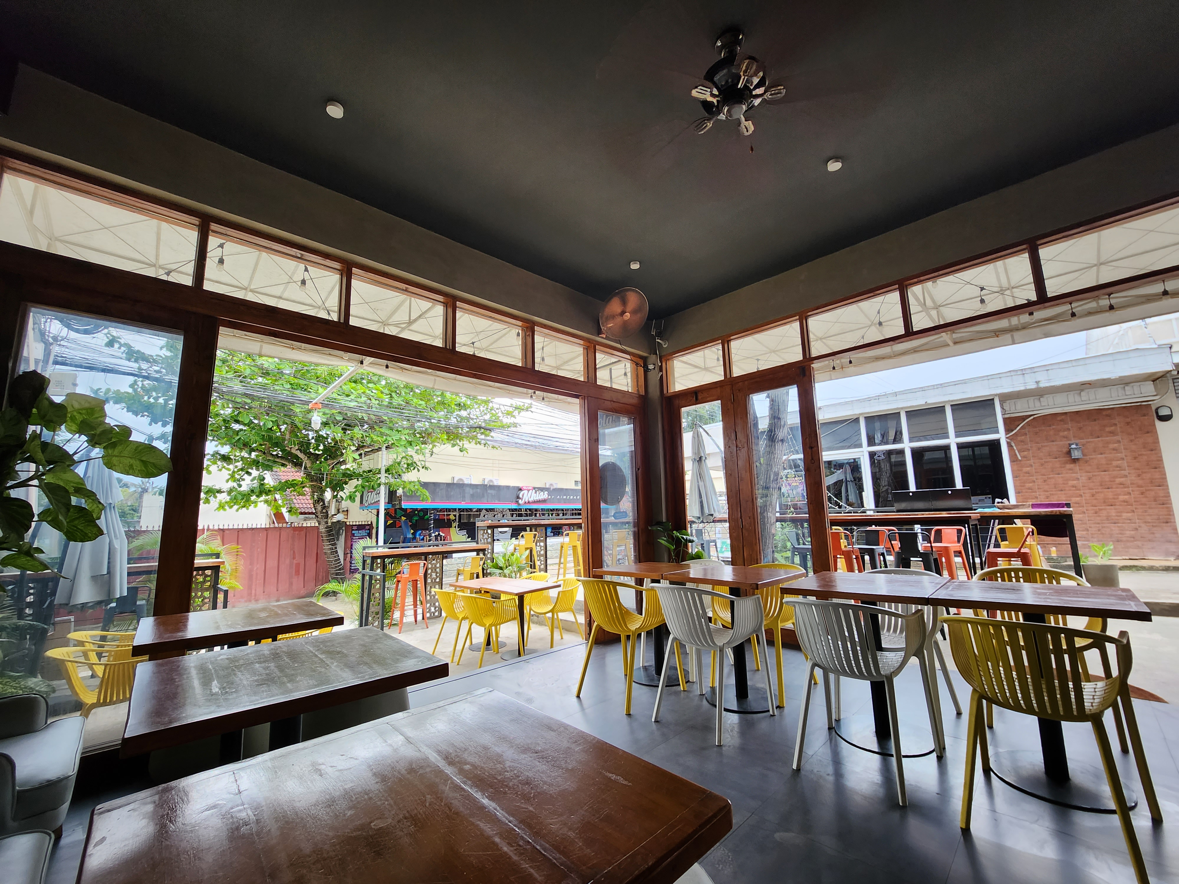 나무와 포인트 "노랑" 체어들과 소품이 어우러진 외관!! 그리고 어느정도 동남아 느낌도 살리고!!