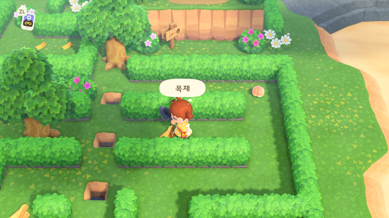 그리고 안으로 들어가서 나무 재료들을 얻고 여기서 복숭아 하나를 더 먹고 나무를 제거해 줍니다.