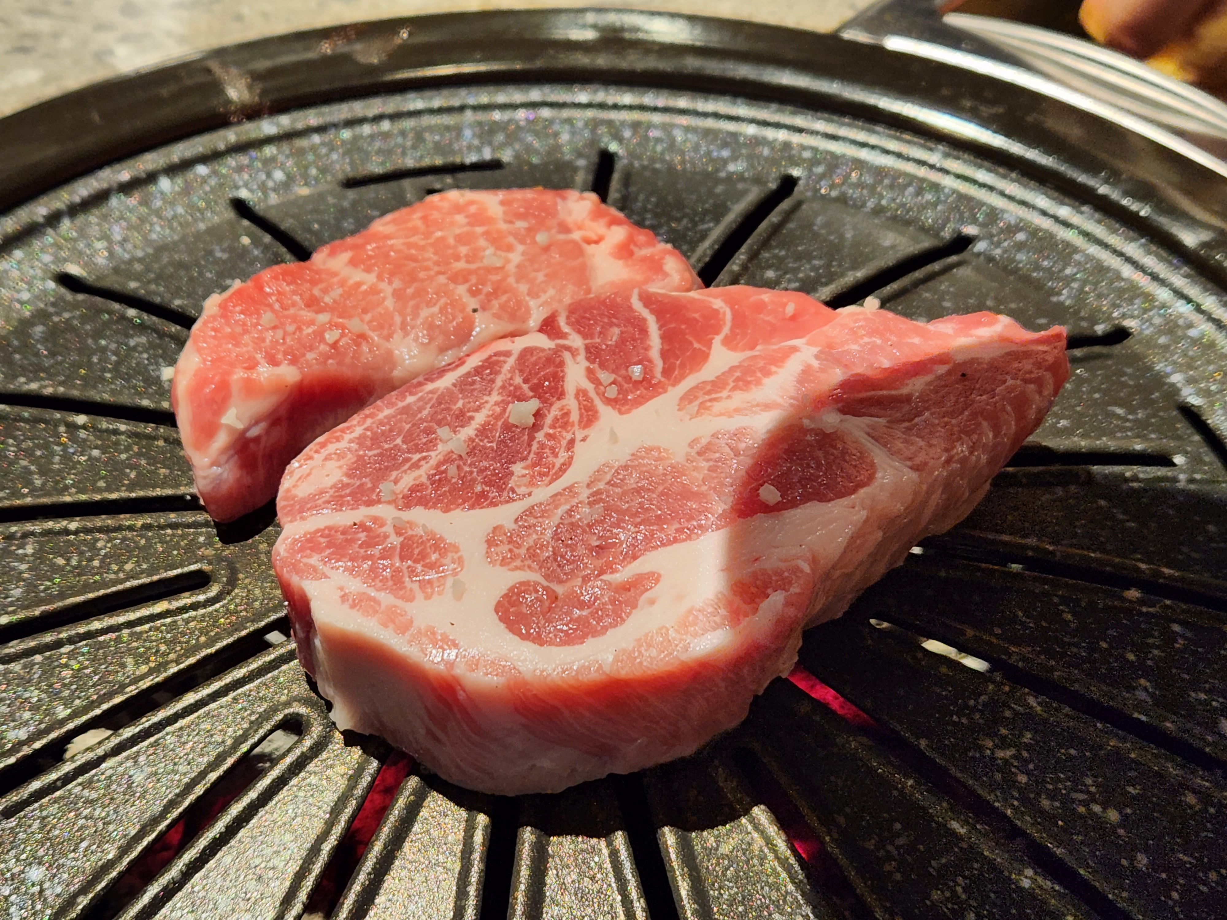 2인분 목살을 순삭하고 국룰대로 고기 1인분을 추가했는데 삼겹살 오겹살 고민하다가 오겹살로 고고 했습니다.