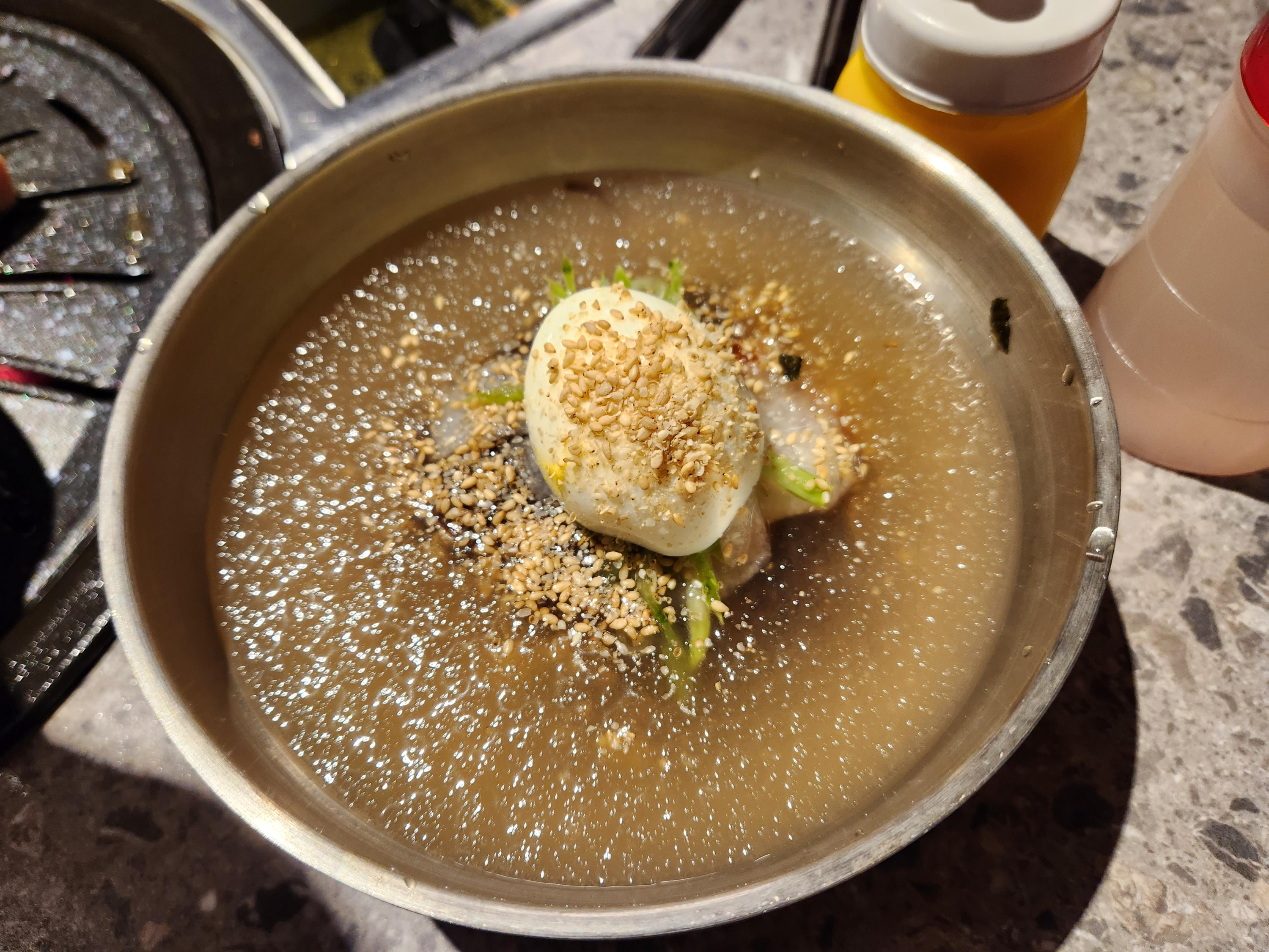 후식냉면은 칡 냉면?? 같은 느낌이었는데 저는 개인적으로 너무 맛있었습니다. 다른 식초나 겨자 안넣어도 육수에 간이 잘 되 있어서 그냥 먹어도 맛있고 면빨을 쫄깃해서 사실 고기 보다 더 손이가더라구요 ㅎㅎ