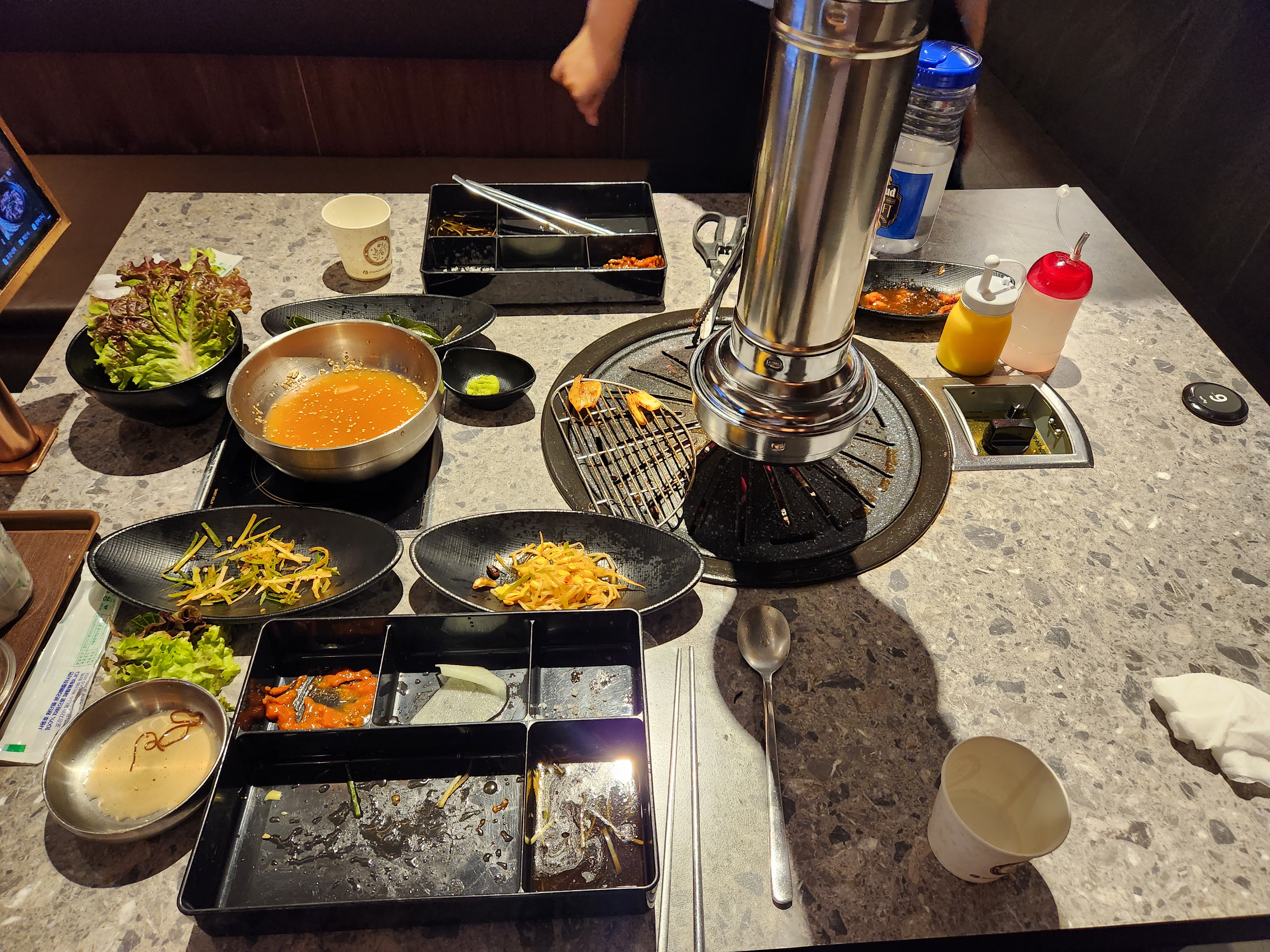 웨이팅후 바로 자리를 안내 받았습니다. 인테리어는 만들어진지 얼마 안되서 그런지 아주 깔끔했습니다. 테이블은 고급 스톤 느낌이었고 불판은 아직 코팅이 윤들윤들하게 잘 살아있었습니다!