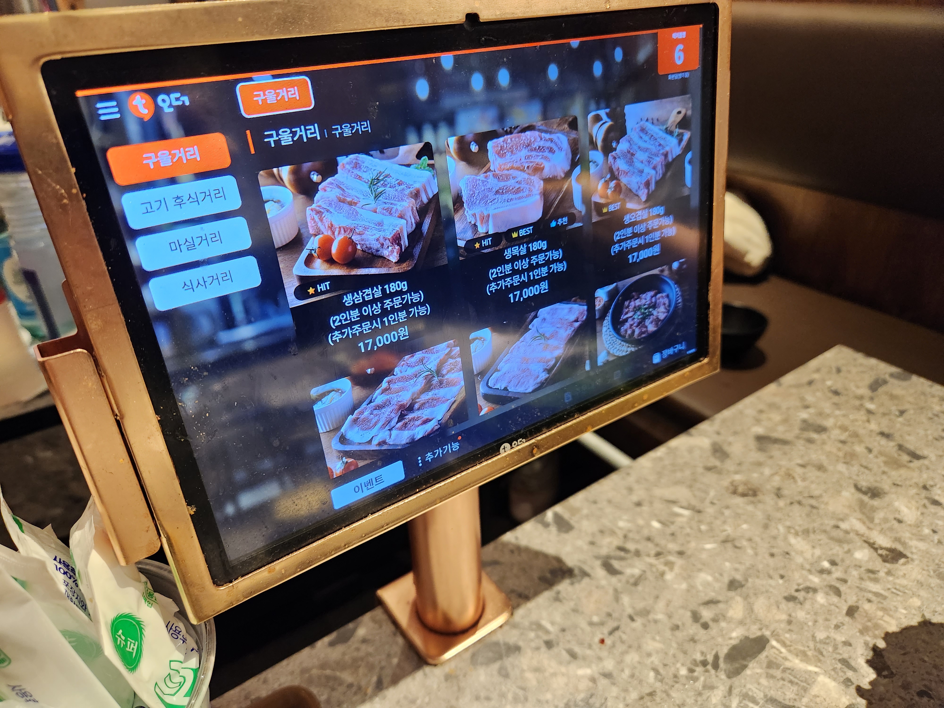최근에 만들어진 식당답게 주문은 태블릿으로 진행하고 메뉴는 색가보다 간촐합니다. 삼겹살 목살 오겹살!! 그리고 뭔지 보르겠는 고기들!!