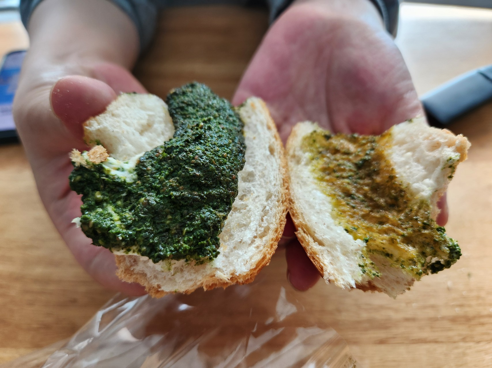 바질 크림 바게트 => 진자 세상에서 처음 먹어보는 맛 이었는데 겉에 바게트는 바삭하면서 촉은 너무 부드러우면서 쫄깃 하고 바질과 크림의 조합이 너무 달지 않으면서 맛을 참 잘 잡아줍니다. 진짜 이정도면 노벨상 받아도 될것 같습니다.